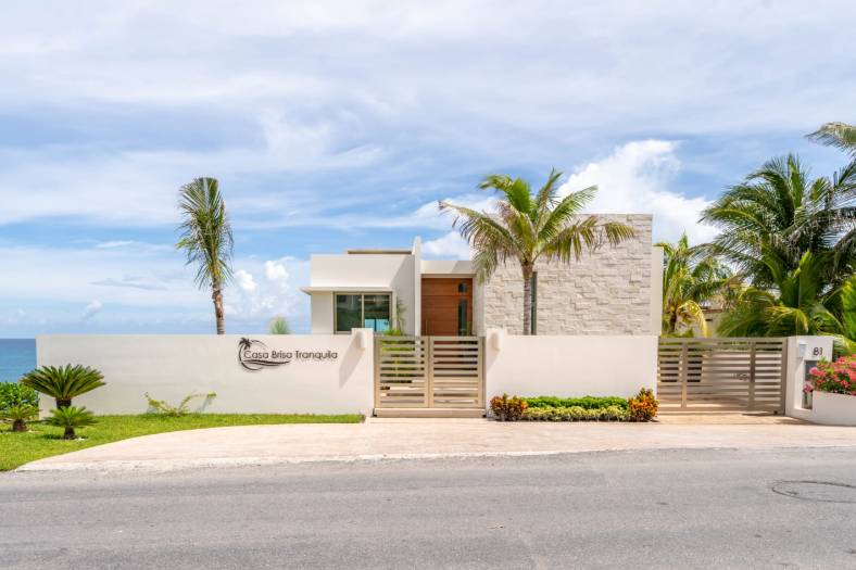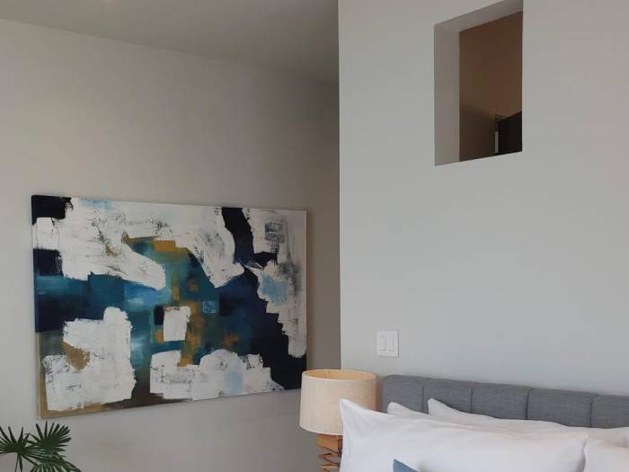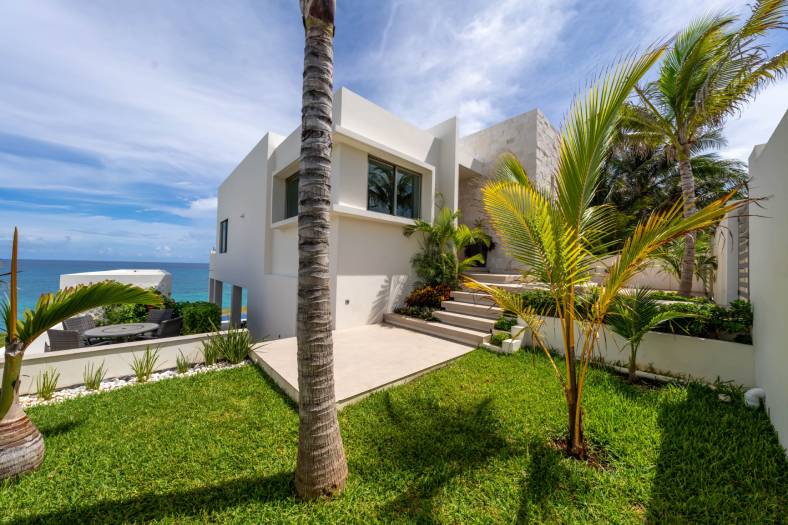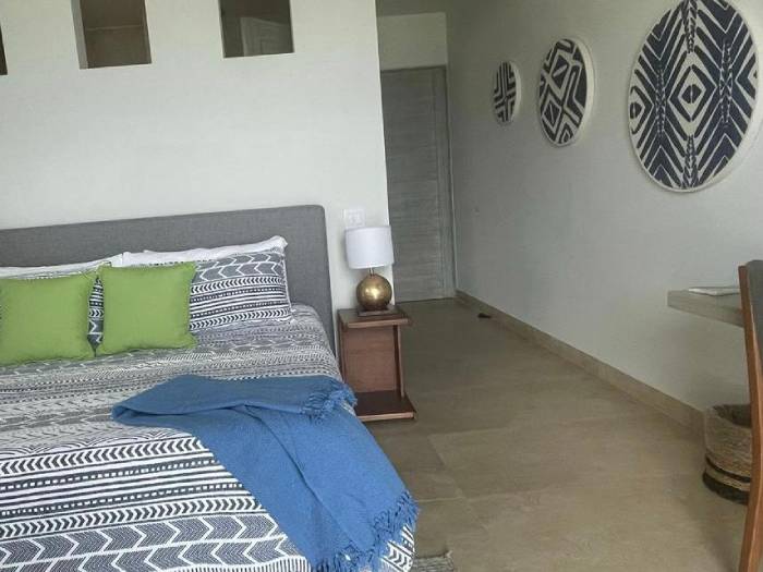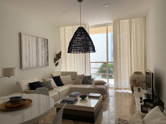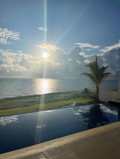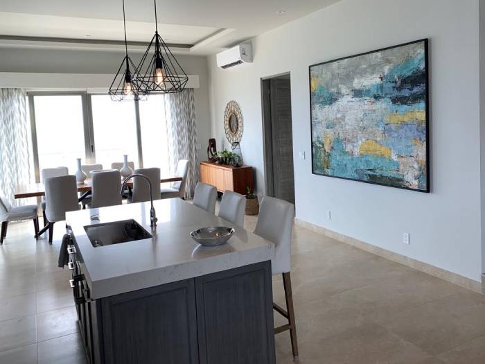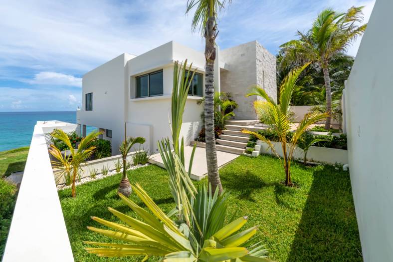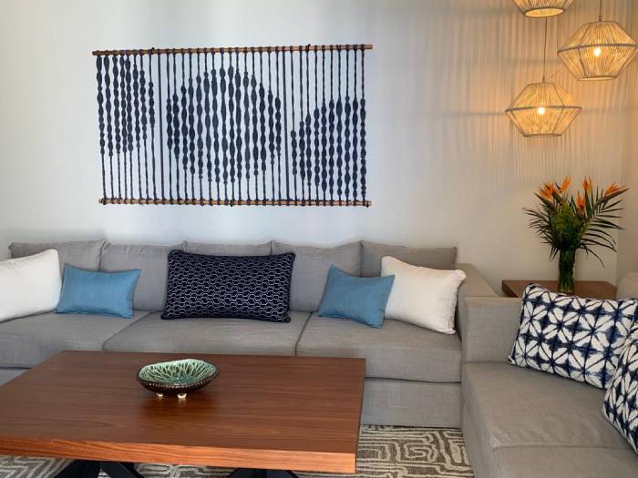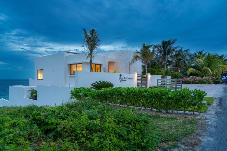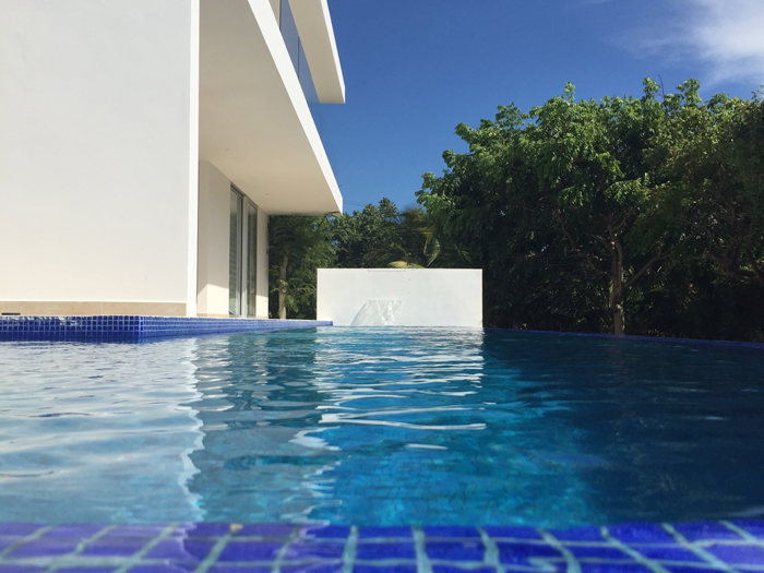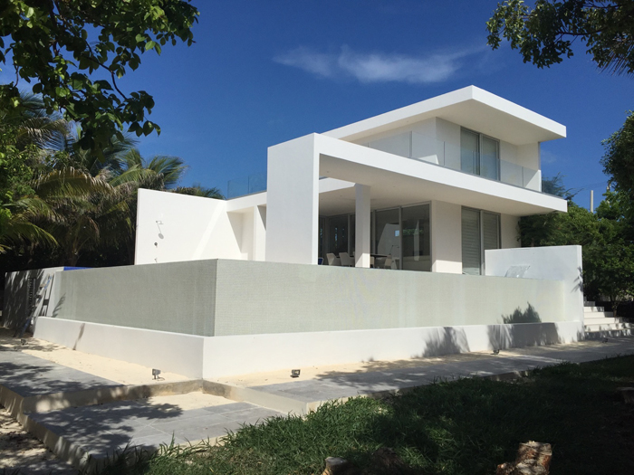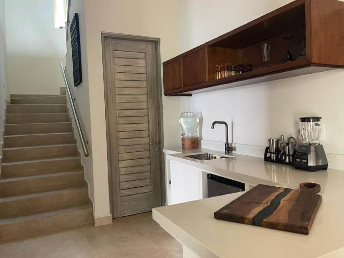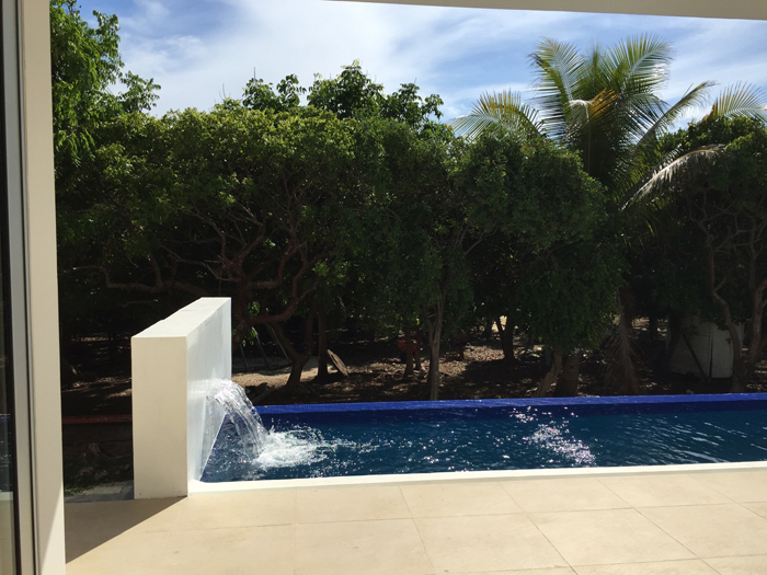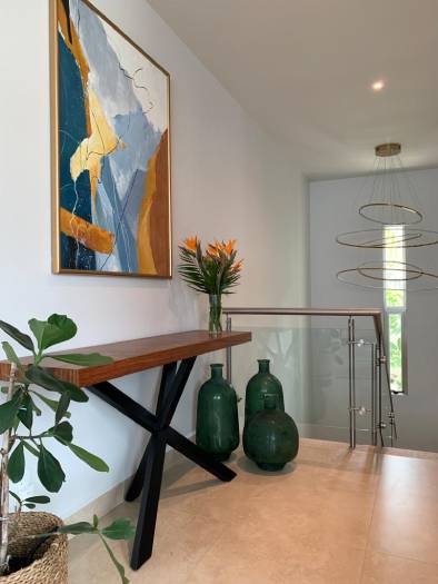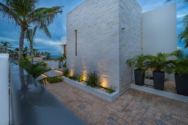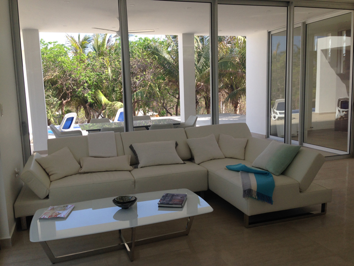 Italian porcelain tiles are used throughout the house, in the natural colours of Balsatina Beige Crema, Bianco, Bone and Stone, creating a cool neutral base. This is complemented by the local Tzalam wood in a bespoke cabinet and various tables and consuls, bringing texture and warmth into the house, enhanced by the softness of linens from the Romo Okari Collection, and local woven rugs. Various artworks from local Mexican artist Alejandro Sabugal adorn the walls adding splashes of colour and vibrancy, in addition to the fabrics of Aztec greens and Midori blues that work in harmony with the ever changing colours of the sea and sky