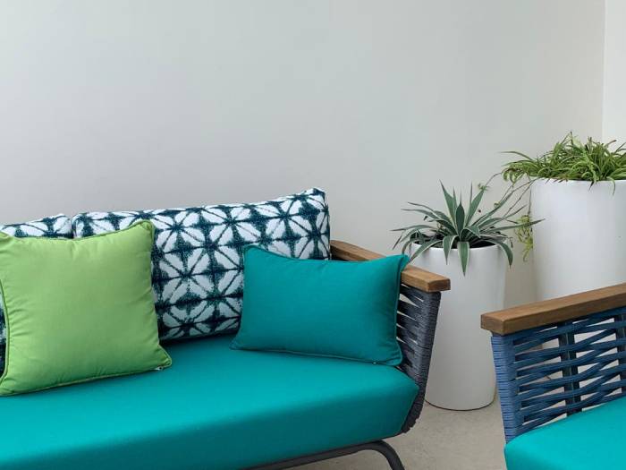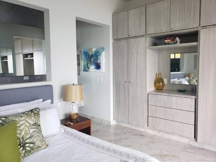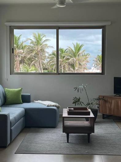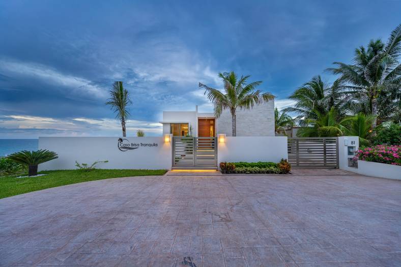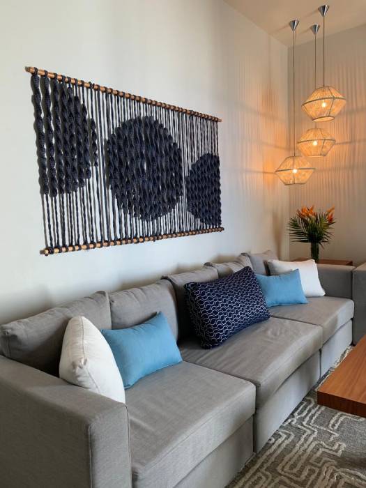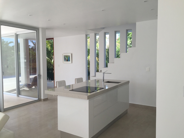 Italian porcelain tiles are used throughout the house, in the natural colours of Balsatina Beige Crema, Bianco, Bone and Stone, creating a cool neutral base. This is complemented by the local Tzalam wood in a bespoke cabinet and various tables and consuls, bringing texture and warmth into the house, enhanced by the softness of linens from the Romo Okari Collection, and local woven rugs. Various artworks from local Mexican artist Alejandro Sabugal adorn the walls adding splashes of colour and vibrancy, in addition to the fabrics of Aztec greens and Midori blues that work in harmony with the ever changing colours of the sea and sky